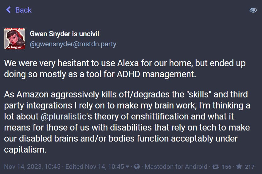 Signal in noise Toot: From activist Gwen Snyder: a thread on the garden walls companies like to build around their app ecosystems and how the relentless push for user stickiness hurts the disabled community and all who rely on interconnectivity between apps: